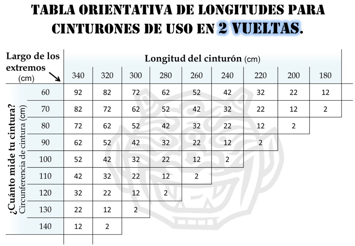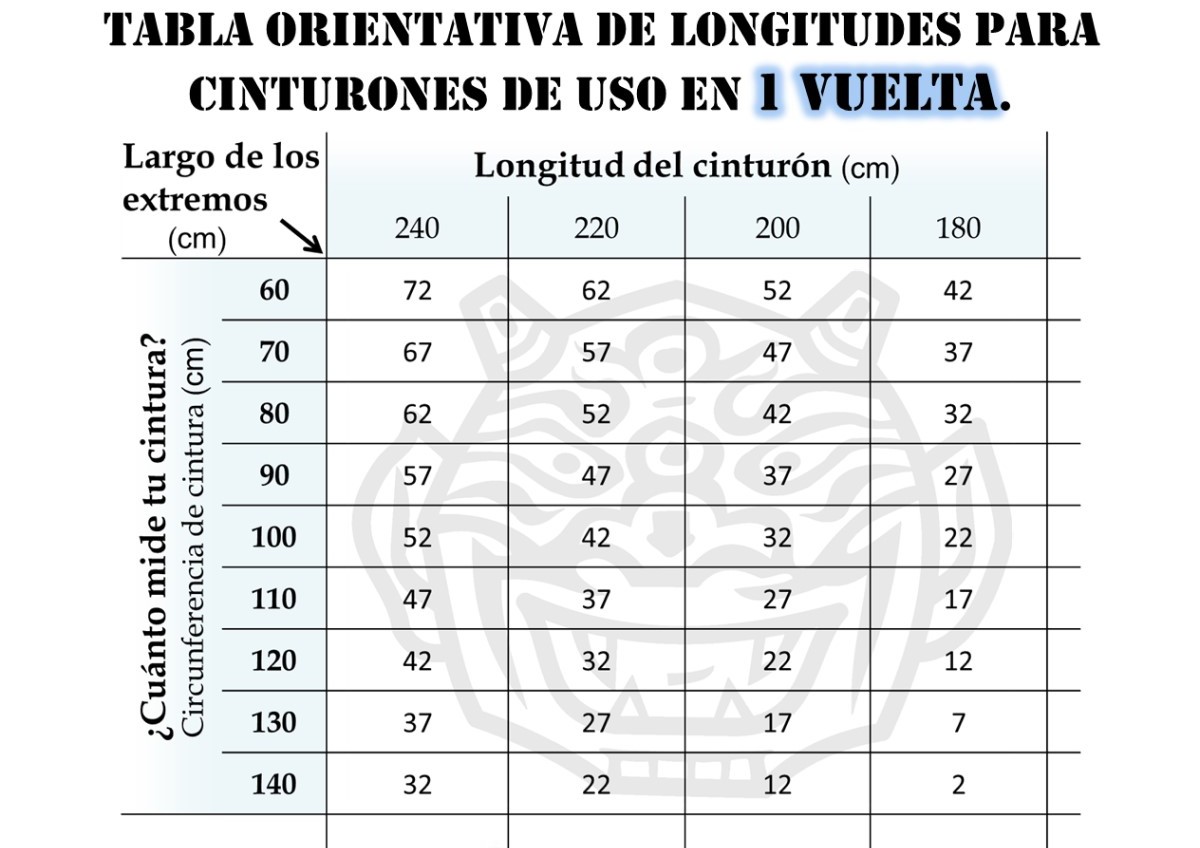 y por ultimo, buscá esos 2 valores en las tablas presentadas a continuación, para encontrar el largo total del cinturón que necesitas.